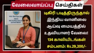 இந்திய வானிலை ஆய்வு மையத்தில் காலியாக உள்ள கீழ்கண்ட பணியிடங்களை நிரப்ப தகுதியான நபர்களிடமிருந்து விண்ணப்பங்கள் வரவேற்கப்படுகின்றன.