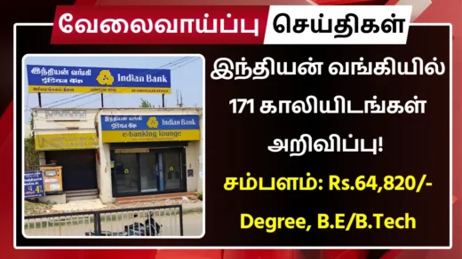 இந்தியன் வங்கியில் 171 காலியிடங்கள் அறிவிப்பு! சம்பளம்: Rs.64,820 | தகுதி: Degree, B.E/B.Tech
